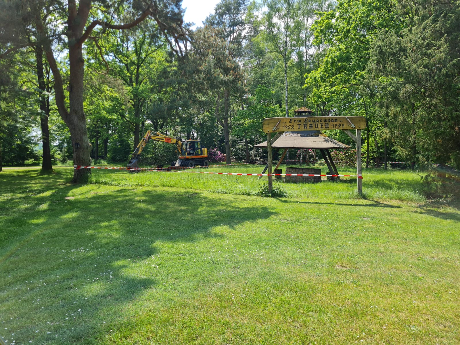 Da der Startschuss für die Erneuerung des Grillplatztes der Ortswehr Trauen gegeben wurde, haben sich einige Feuerwehrkameraden hinter unserem Gerätehaus eingefunden um mit Hammer, Schaufel, Säge sowie Großgerät den Grillplatz abzureißen. In Arbeitsgruppen von je 3 Mann wurde, unter Einhaltung der Hygienebestimmungen, die zum Teil morschen Bänke abgebaut und eingelagert. Mit freundlicher Unterstützung von der Firma I-Bau riss ein großer Bagger erst die Grillhütte und dann den Grill ab.
